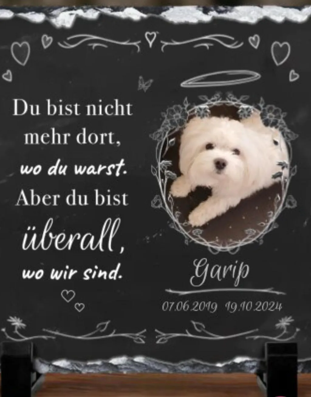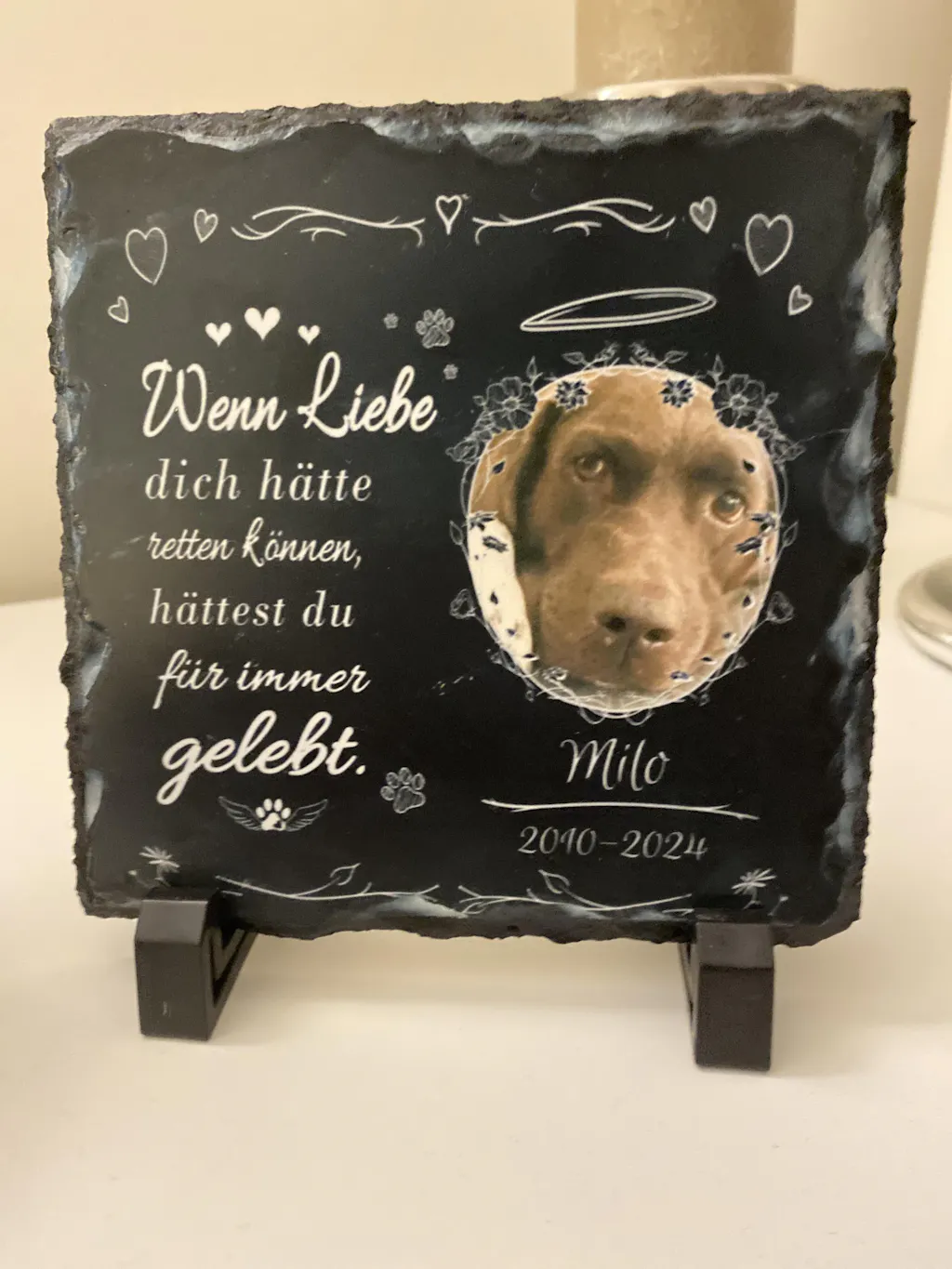 Die Trauer-Schiefertafel bietet einen liebevollen Weg, um die Erinnerung an verstorbene Haustiere zu bewahren und in Ehren zu halten. Dieses besondere Andenken ist mit großer Sorgfalt und Liebe zum Detail gefertigt, um Trost in Zeiten der Trauer zu spenden und die unvergesslichen Momente für immer festzuhalten.
