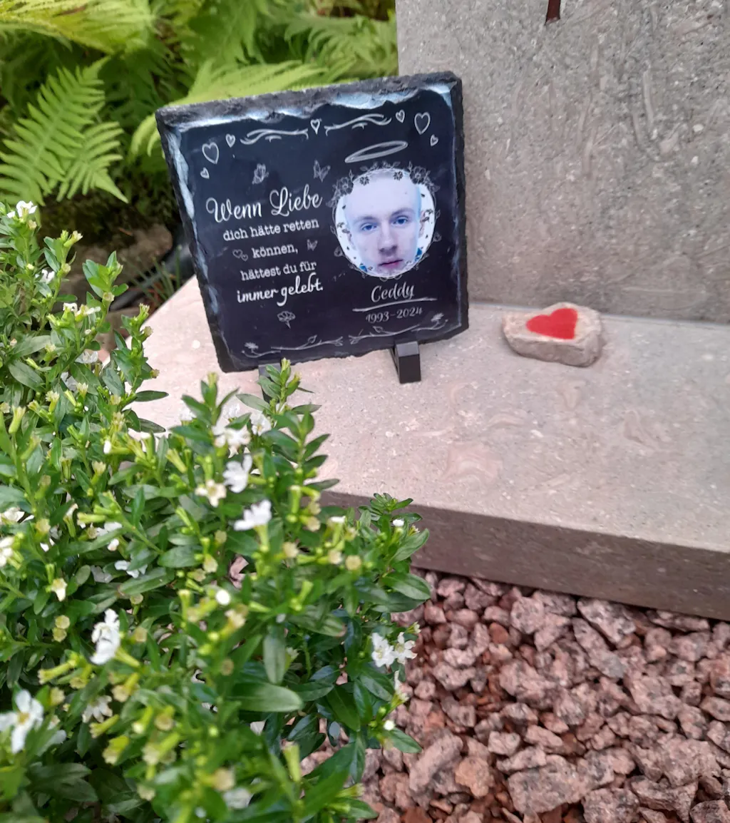 Halte die Erinnerung an deine Liebsten wach und spüre die tiefe Verbundenheit mit unserer personalisierten Trauer-Schiefertafel – ein liebevolles Andenken für die Ewigkeit.